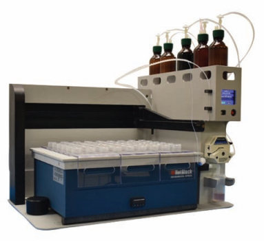 – 适配所有尺寸的 HotBlock® 消解仪用于全自动添加试剂– *多可添加五种不同试剂– 在更换消解方法时无需更换试剂瓶——五通阀系统使试剂间能方便切换– 附带的软件管理设备按照用户的程序分配试剂– 通过集成的 Masterflex® 蠕动泵配添加试剂可精确到±2%容量——校准到任意添加容量– 与全自动石墨消解仪相比更经济– 适用于通风橱适配所有尺寸的 HotBlock 消解仪的 AutoBlock Fill全自动加样工作站提供了一个安全、经济的方式,全自动执行消解中*危险的步骤——试剂添加。通过自带的触摸屏或使用附带的软件直接连接电脑来控制系统。设备包括: 集成的 Masterflex® 蠕动泵, PTFE 管, 5 个 1L 玻璃试剂瓶,以及废液桶。